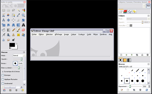 - Au premier lancement de Gimp apparaissent trois fenêtres distinctes : deux fenêtres latérales qui occupent toutes la hauteur de l'écran et une fenêtre centrale comportant des menus.